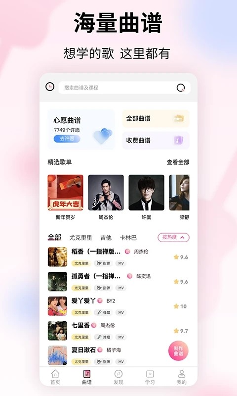 海量的吉他谱库:提供多种吉器的分类、搜索及推荐等功能来满足用户的不同需求。