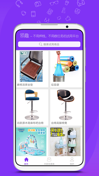 领趣能给用户轻松试用自己需要的商品,这里有各种各样的商品资源可以挑选购买的哦!并且在这里购物还可以领取优惠券福利哦,让你花最少的钱买到喜欢的好东西哦!