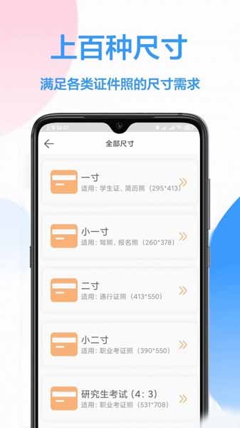 12、【海量尺寸库】涵盖500+证件照所需尺寸,包含了常规的社保卡报名、计算机二级报名、驾驶证、导游证、公务员、社保证、学生证等各类认证类别,还有各国语言旅游签证、宝宝证、工作证、结婚登记照、驾考、护士证、护工、会计、幼师考试、研究生、职业资格、成人高考、学历考试等等。