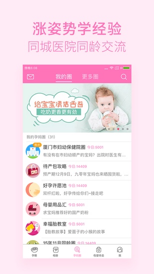 支持微信、微博、朋友圈同步你的怀孕记录、孕检计划、怀孕食谱、孕友圈、孕童趣、备孕日记,与千万姐妹一起交流怀孕经验、分享怀抱回忆。