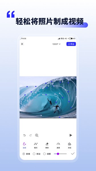 的照片动起来是一个图片视频修剪、拼图、照片转GIF、视频转文字、视频配音、照片编辑器、照片压缩、图片裁剪和视频合并等功能,支持将图片转换成gif动态图片或动态视频。