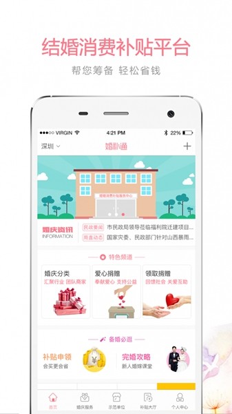 婚补通APP是为新结婚用户打造的消费帮助平台,软件中有着海量的实用功能等你体验,你可以在线浏览最新的婚恋动态资讯信息内容以及各种服务项目选择。操作简单使用方便快捷!对软件感兴趣的话不妨点击下载试一试吧!