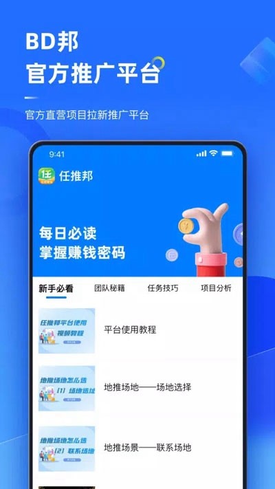 任推邦APP是一款手机推广软件,用户可以在任推邦app上发布自己的广告信息和营销方案等内容。通过该工具可以快速的将产品进行引流、销售以及宣传等等操作!欢迎下载使用吧~