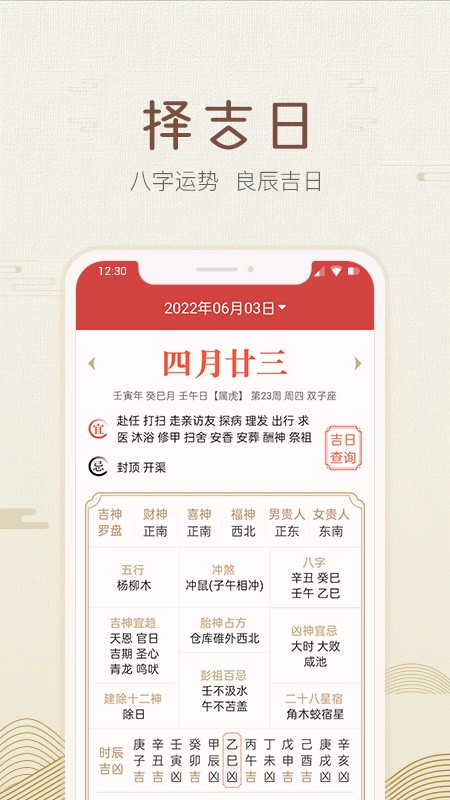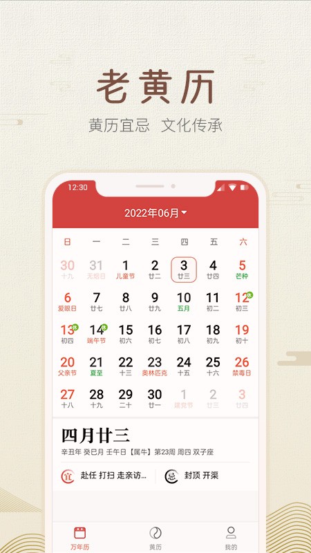 一款集日历+记事本为一体的生活生活小帮手。通过它用户可以通过手机便捷地查看农辰吉凶、天气预报、节假日安排、节令宜忌、节日节气的介绍及提醒服务功能;提供万年历计算器与农历转换方式供用户使用。