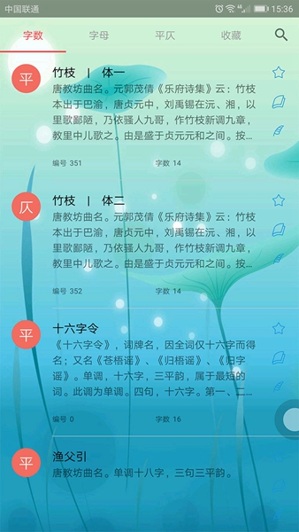 诗词:包含了丰富的诗词库供用户选择并提供注释、译文和赏析;