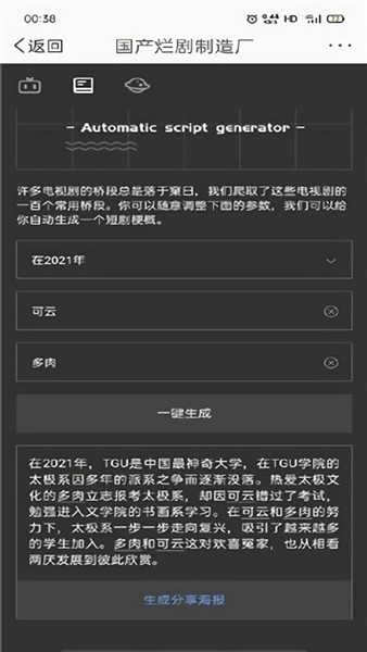 自动剧本生成器是款非常有趣的游戏制作工具,在手机上即可轻松创建各种类型的剧本并进行编辑和创作。支持多种语言环境使用,操作简单易上手,适用于不同年龄段的用户!欢迎下载!