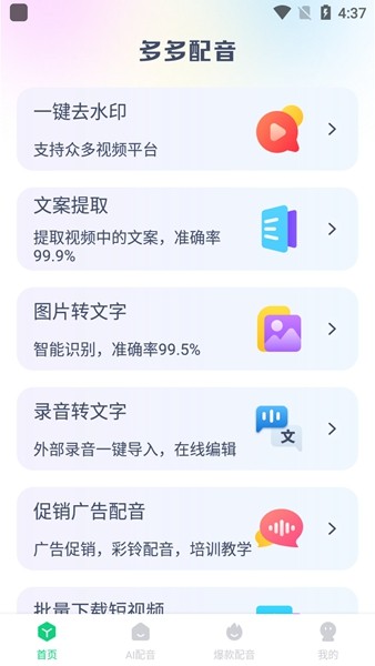 首先打开多多配音app,进入主页面后点击“+”,再选择需要处理的图标即可搞定所有事情。