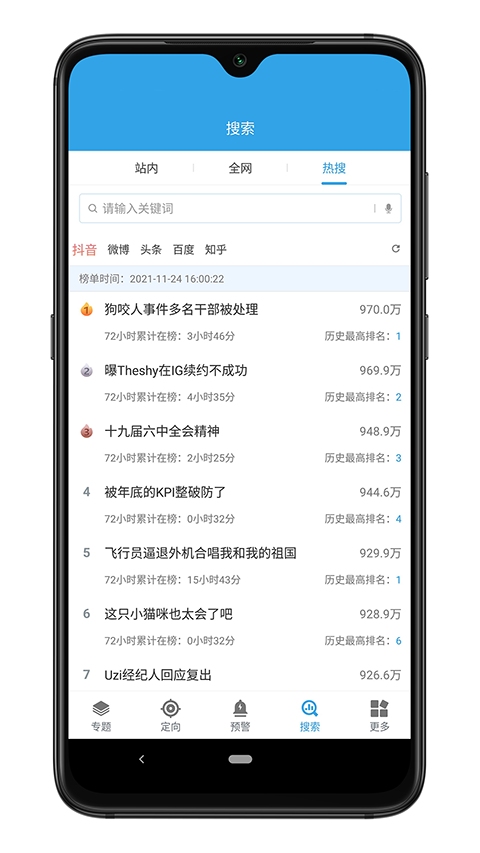 华云舆情APP提供了强大的热搜词功能,包括热搜话题、热搜排名、热门榜单以及热搜排行等多个维度的数据指标供用户查询参考。