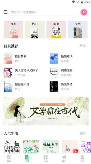 [小说分类清晰]书城分类覆盖总裁豪门、言情穿越、玄幻奇异、武侠仙缘、青春校园、军事战争、悬疑灵探险、科比特等等,给你超强代入感。