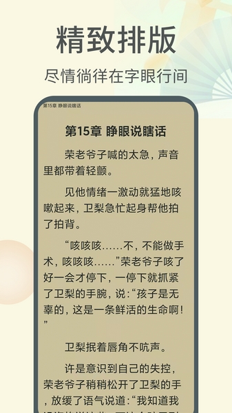 ●【听书模式】:解放疲惫的眼睛,满足你挑剔的耳朵;仿真翻页效果,自定义背景字体,开阔屏幕又不失雅致!