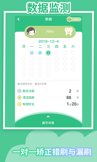 记录您的刷牙练习过程中的点滴成长变化,并生成相应的图表数据分析报表及趋势图展示(报告可分享到qq群/朋友圈);