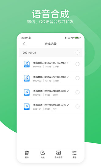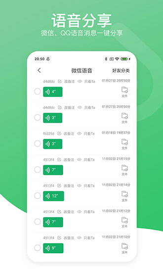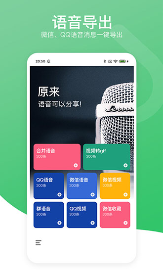 语音导出分享助手app是专为微信和QQ好友打造的一款功能强大、操作简单且安全可靠的专业手机转发软件,该软件不仅支持将微信中的语音合并成一条条或一条频繁播放的小语音内容进行一键快速发送到微信中。并且用户只需要点击相应的链接便能够轻松完成账号与平台的切换使用哦!