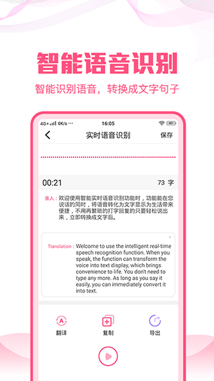 是一款专业的手机便捷工具应用,支持对图片转文字(拍照翻译)以及实时记录笔记的功能!用户只需简单几步就能完成多项工作流程:一键生成文档/会议内容或课堂上讲座中的语音对话框,方便快速地分享给同事及同学。这款高效且易于使用的语言学习助手app不仅满足了日常生活中各种场景下的日常交流需求,还通过智能化的数据分析技术为用户呈现出精准的结果报告。此外,语音文字转换大师更是让您在工作中能够更专注于重要事情本身,提高工作效率,提升工作质量。