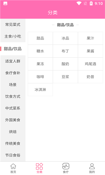 5、【分类】栏目涵盖众多菜品类别:烘焙甜点、孕妇辅食、产区饮料、宝宝乳喂营养、减肥健身餐等,不同品类的菜肴都有详细教程详解以供参考了解。