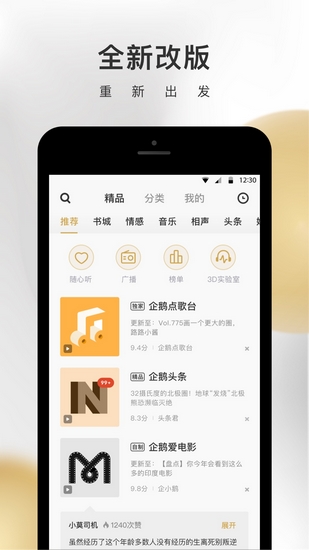 企企鹅FM拥有众多国内知名电台中、广播电台、主播,以及数万名有趣的主播,企企鹅FM是目前最大、最受欢迎的在线收音机;