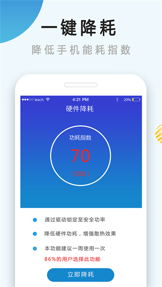 1、优化系统,提高系统运行速度;2、降低耗电,提升电池寿命;3、一键加速,减少cpu温度的消耗。