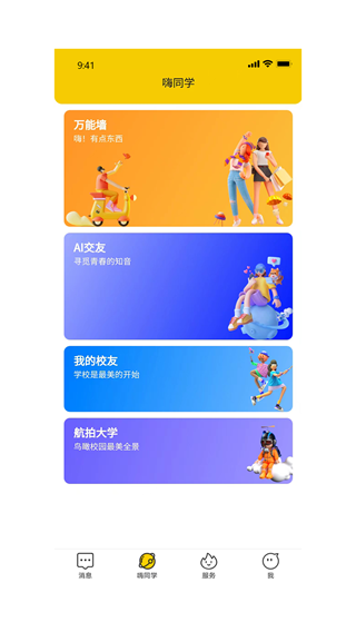 嗨同学是款为大学生量身定制的校园服务APP,专属于大学生用户的在线校内生活圈。这里有各种各样的大学资讯内容为你提供学习指导、课程咨询以及考试通知提醒等等功能;还可以在这里与更多的大学生互动交流哦!