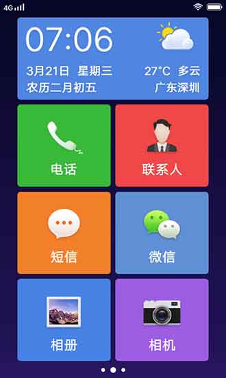 简易桌面上是简体桌面,也是为中老年打造的桌面。极具个性化的主题壁纸和快捷方式一键设置、简单方便地查看信息等功能满足您的不同喜好需求,为您节省更多时间与精力。