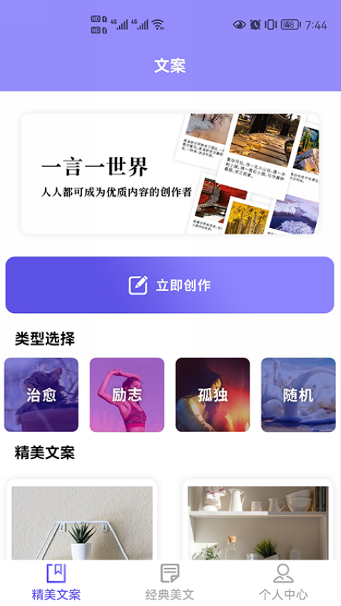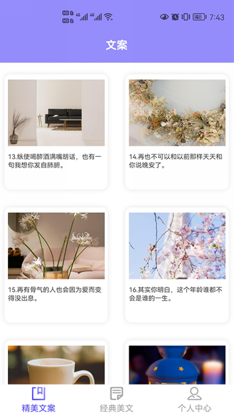 文案迷一款超级好用的主要为用户提供文字创作的APP,通过软件可以实现一键搜索查找图片资源进行各种类型的内容展示并配图让您的文章更受欢迎有趣,喜欢写文案的用户可下载试试看哦!