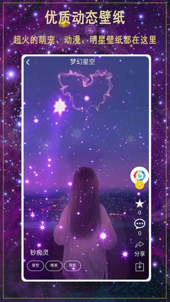 3、一键分享功能:通过该应用将喜欢的壁纸生成成高清的壁纸照片或者是GIF动图,方便快捷地展示给朋友们;