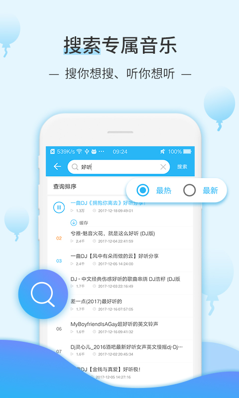 中文/英文+韩文音效/慢速、喊麦、电铃声/车载、Remix、网络红歌,只有想不到,没有找不到;2、同步更新:每天都有新歌首发,DJ流行金曲第一时间播报;3、搜索热词榜:全球流行经典歌曲一网打尽,好歌轻松搜;4、分类清晰明确:根据不同的场景推荐相关内容供用户筛选查看和试听;5、本地播放管理:快速扫描手机内存中的歌曲并直接导入本地设备中进行在线播放及离线缓存服务。
