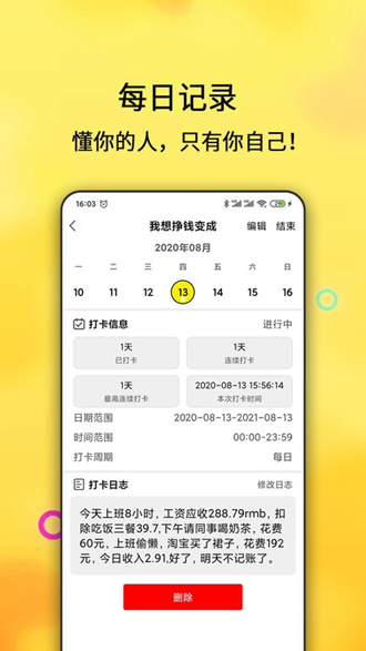 直观查看每一天的日程表情况及历史记录数据分析服务功能等内容查询工具使用方式选择多种类型一目了然掌握详情了解详细动态变化管理更加便捷高效合理化规划生活办公体验有条不紊地养成好的习惯完成自己专属的小目标达成好习惯每日签到即可获取金币奖励领取现金红包提现无门槛收益多多随手就能进行自由设定每天的好习惯来培养自己的小伙伴一起坚持打卡做事变得更加自律更自律更好玩哦