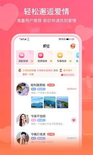 即见app是一个非常有趣的线上交友平台,这里的用户都是通过实名认证的,并且经过严格筛选后方可进行社交哦,而且在这款app中你可以找到很多同城用户来一起聊天玩耍,感兴趣的小伙伴快来下载体验吧!