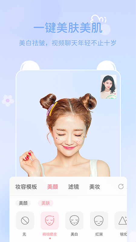 2、【超强修饰】:可磨皮美白祛痘,细腻纹理,精细补光,提升清晰度。