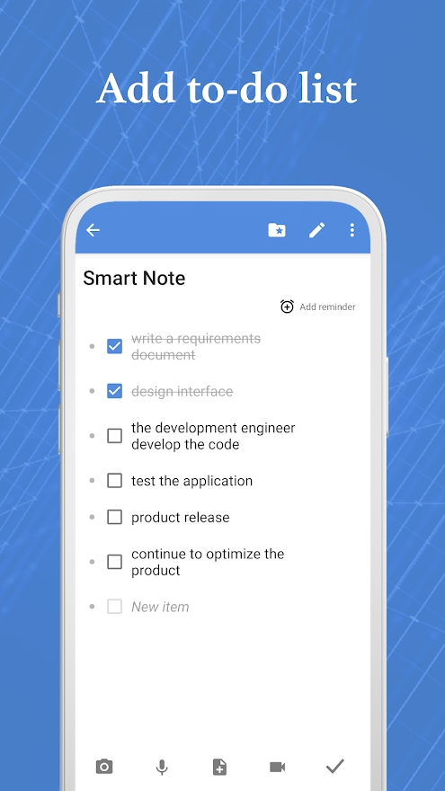 Note是一款高效简洁的记事本软件 Smart记事本app是一款非常好用的手机软件,使用其能够轻松记录各种内容。用户可以将生活中的事情进行备份保存下来的便签笔记等信息导入到软件当中来方便日后的查看工作、学习等等事项完成状态;并且还可以对重要事件发送提醒功能!需要的用户快点来下载吧。