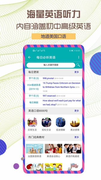 每日必听是为喜欢学好英语的用户量身打造的一款英语学习工具。它拥有海量的英语学习素材供大家免费使用,包括日常用语、商务职场、旅游出行、校园生活、校园生活、家庭作业等各类场景中的内容,