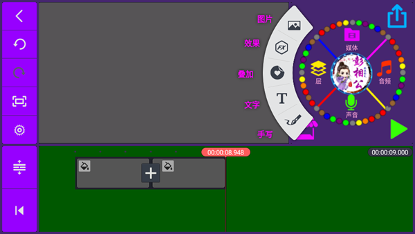 2.【色度键】一秒变白底黑底,让照片与众不同;3.【文字添加字幕】自定义文字颜色,大小,位置,字体任你选;4.【转场动画】酷炫衔搭效果,让图片更具情趣!5.【音频提取】快速将视频中的音乐导入,配上完美背景音乐;6.【变声】语音识别+人脸抠图,更有超多音调调节哦~7.【画幅比例】多种分辨率自由切换,支持720p/1080P画布拍摄;8.【分享给好友】直接社交网站上传,还可以保存到自己的朋友圈;