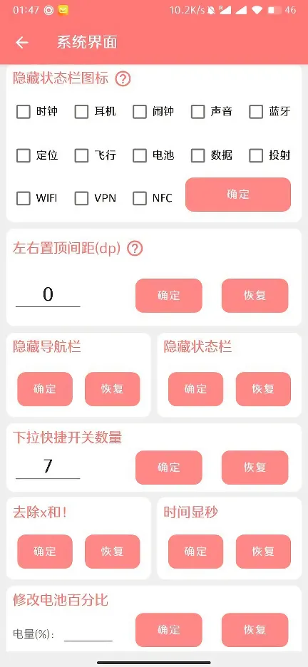 大小、位置、反编译模式(DPI)、分辨率设置、黑暗模式、高亮模式、全局夜间模式、隐藏系统参数、应用列表、权限管理、备份恢复、应用安装/卸载/备出库应用、强制停止运行目录、自动清除缓存、。