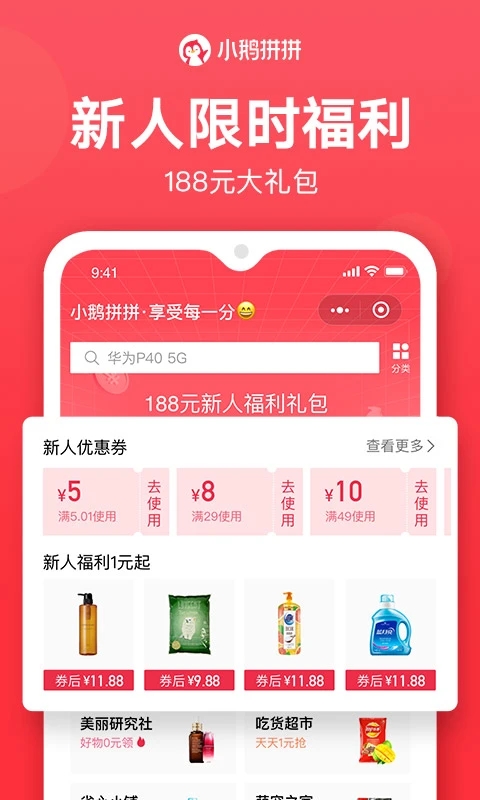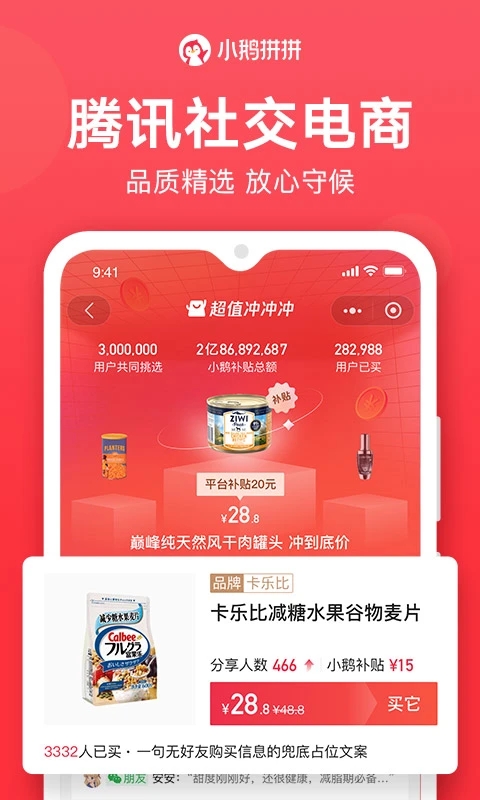 小鹅拼拼是属于腾讯的社交电商线上购物app,这款软件为各位用户提供非常全面的商品资源内容,这里有各种各样的商品优惠活动等你来参加!