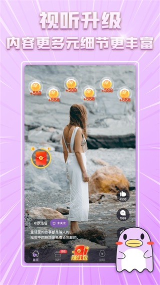 1、随时随地都可以在线浏览喜欢的短视频信息:无论是搞笑还是美食,你都可以在这里看到很多有趣的短视频作品。2、海量优质原创短视频供您欣赏:无论何时何地的,你都可以打开应用观看视频赚取奖励,包括各种各样的红包奖励。3、邀请好友也可以获得红包奖励:邀请朋友一起使用该应用程序就可以领取现金奖励,让你能够更轻松地获取红包奖励,非常简单。