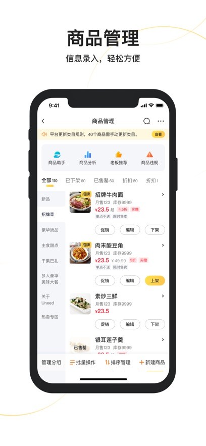 美团外卖商家版是美团外卖为商户量身打造的店铺管理应用,可以轻松帮助你进行线上订单处理和退款等操作。软件功能强大且齐全,能够让大家在手机上快速完成各项日常工作任务;并且用户可以通过该软件在线查看自己商品的具体库存情况并及时补充货源信息!