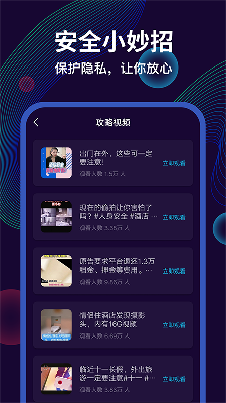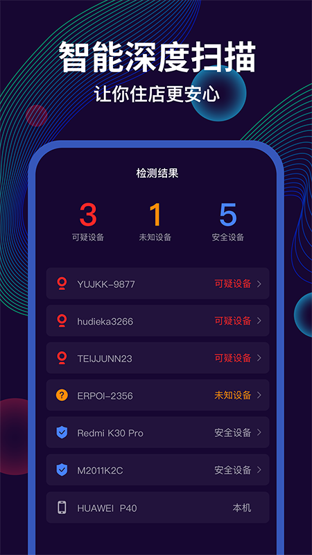 在这款app中,大家需要利用网络识别摄像头的强度来判断是否存在偷拍摄像头,这样一来就能够有效的防止被偷看,并且还能保护我们的眼睛,让大家在出行时也能放心使用这款软件呢!