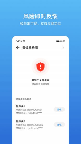 查找摄像头探测软件app支持使用语音和手势两种方式快速定位摄像头的位置,同时还支持一键复制摄像头信息并发送给好友分享出去,有需要的朋友欢迎前来下载使用~