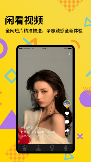 闲看视频是款简单方便的手机短视频播放和下载工具,通过开启用户们就能快速获取到我们喜爱的视频内容。软件用法也非常简单适合我们进行使用和其他功能选择上超多观看体验不妨速速下载试试吧!