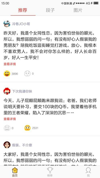 谦段子app是款非常流行的搞笑段子软件,各种搞怪的段友在这里都有分享哦,让你可以快速刷爆朋友圈。平台上每天都会有超多搞笑段子提供给大家使用,让用户们可以在其中找到很多幽默感的段子内容!