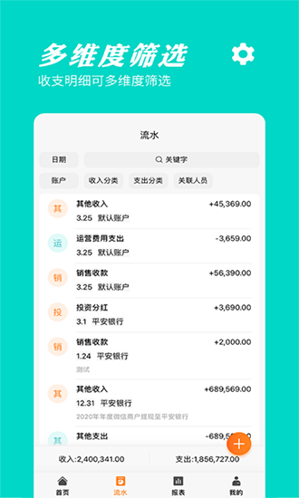 内置自定义排序工具能按日期、年份对你的财务状况进行精细化的管理;支持添加多个标签同时处理不同项目中的费用流水清单及资产负债结构等等。