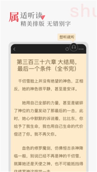 小说听书宝典!百万正版畅销小说、玄幻奇幻小说、都市言情小说、武侠仙侠小说、青春校园小说、穿越架空小说、惊悚悬疑、历史军事、耽美同人、官场权势、职场竞技、科创板体育等各类小说应有尽有,更有名家热评单品、经典完结榜、热门原创小说等海量优质内容为你提供;更有专业主播录制的节目将为您带来极致视听享受,让你沉浸在精彩小说世界,感受真正的文学魅力!