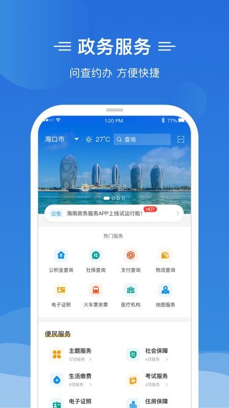 海南省居民为用户提供了全方位的一站式解决方案,涵盖了社保参保管理(参保登记备案、社保卡申领、社保补办、医检核验、社保缴纳、公用事业缴纳、城乡规划、养老保险、生育收养证明、不动产登记、居住证申请、户籍变更、车辆违法处理、涉外保险报销、税务筹划申报等多个方面,实现了一网通办、一端在手,随时随地掌上办公。