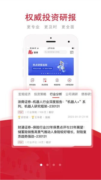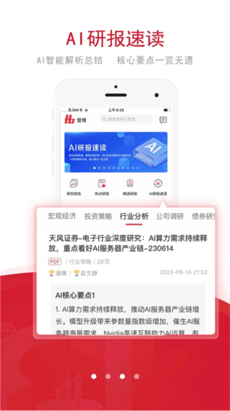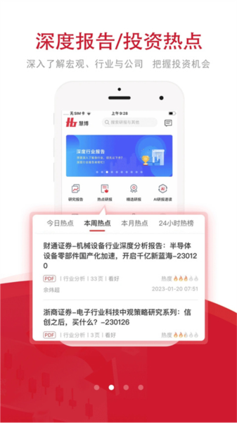 慧博投资研究报告数据商是一款专为金融投资者打造的行情分析软件,该应用拥有丰富的功能和服务可以选择使用,用户通过慧龙投资研究报告查看到全球重要市场动态和市场信息等内容;慧阅投资研究报告统计的数据实时掌握在手中,随时都能获取到最新的消息通知以及交易机会、资金流向情况。