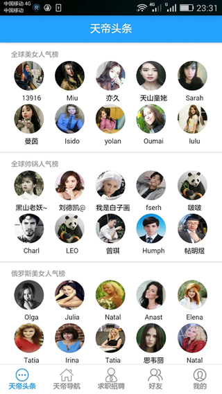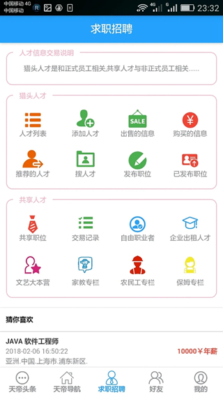 天帝会汇聚了交友app是一款专为年轻群体打造的线上交友平台。这款软件不仅可以帮助用户快速找到自己心仪的工作,还能结识到志同道合的朋友,拓展自己的人脉。通过天霸会汇聚了交友app你可以轻松认识各种有趣的用户和他们一起聊天互动,互相喜欢就能直接开始畅聊,非常方便哦!