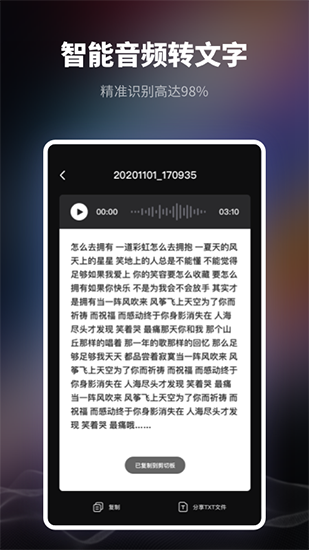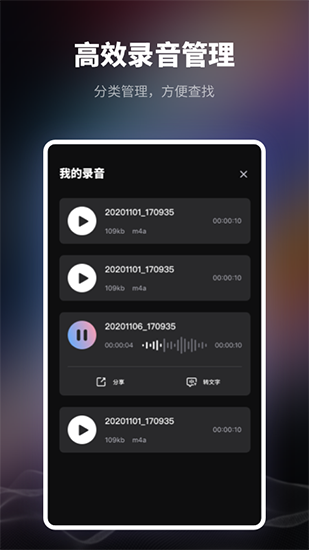 智能录音机简单易用,让你可以随时随地进行使用。这款软件支持在不同场景下使用的语音转文字功能,不管是会议、讲座还是演讲等都可以帮助你轻松完成各种操作。而且还可以实时记录自己的工作内容和信息!欢迎大家下载体验!