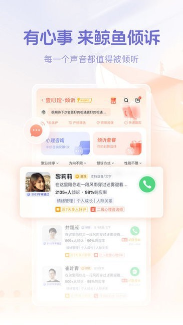 鲸鱼倾诉app是一个专业的心理咨询服务平台,平台上拥有大量的专家和专业的人员为用户提供专业、权威的心理咨询解答。用户可以在这里找到各种心理问题进行交流学习或者是寻找心理健康知识等功能!