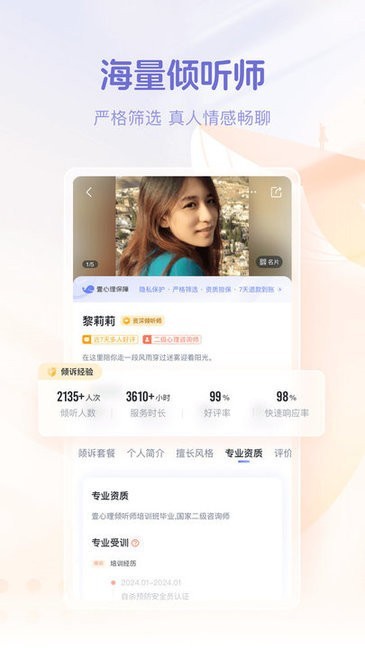 我们致力于打造一个专业的、权威的心理咨询平台;在我们的产品中,每一位心理咨询师都经过严格筛选、严格培训,以确保其真实可靠地给出准确的信息及建议,并通过严谨的认证制度,为您解决生活中遇到的所有烦恼。同时,我们在不断努力,不断优化体验和服务,为广大的心理咨询师提供更优质的服务。