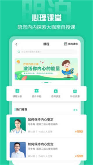 明泊心理是款心理健康服务类型综合性手机app,软件内用户可以在线进行心理咨询操作体验。在软件中提供各种专业的心理测试和学习课程内容供用户选择使用,还有心理知识等你来了解哦,快来下载试试吧!