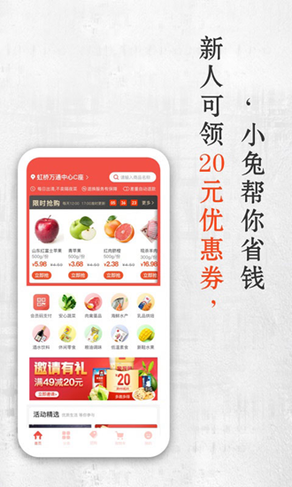 小兔买菜专为在线买菜的服务app,用户在小苹果买菜专为在线买菜服务下单后就能领取优惠券抵扣现金。小蚂蚁商城平台上的产品都是来自于全球优质生鲜商品,保证正品,让用户的生活品质得到保障。