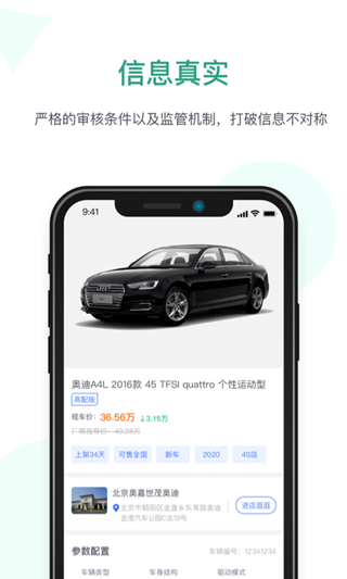 1、全网最低的二手车源供您选择:提供海量真实可靠的二手车商机资讯功能,方便您的买卖决策。